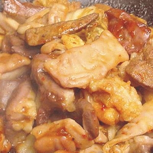 国産豚生モツ(生白もつ、ガツ、レバー、ハツ)、たれ{醤油、砂糖、味噌、清酒、ごま油、にんにく、唐辛子、調味料(アミノ酸)、着色料(紅麹)、(原材料の一部に大豆、小麦、乳成分を含む)}